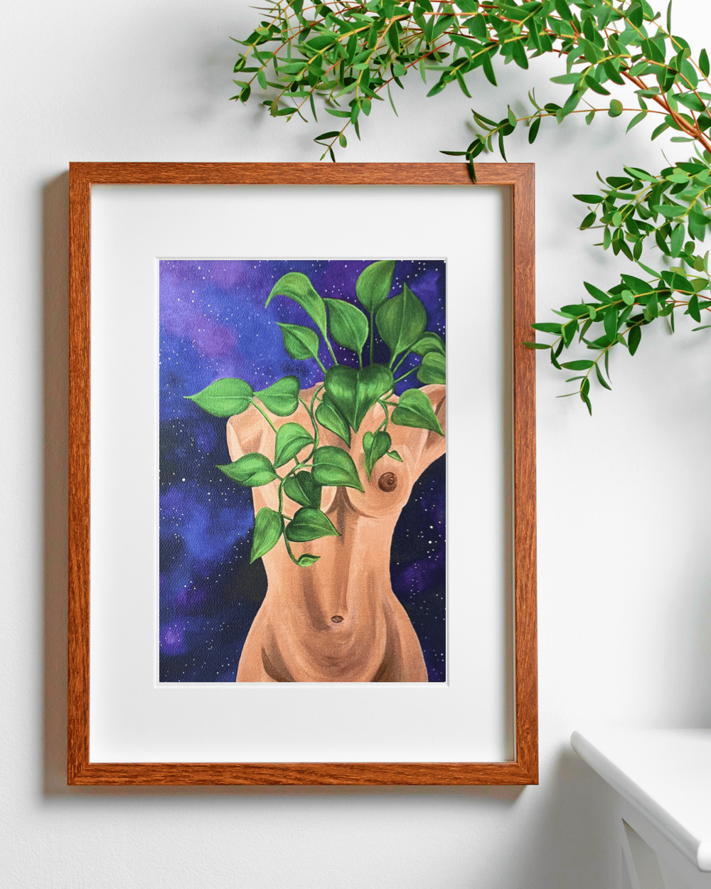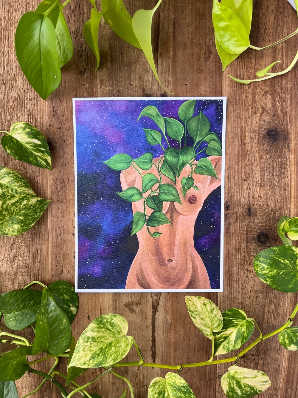 Print of a naked female body with pothos vines growing where the head should be and a blue/purple/black galaxy background.
