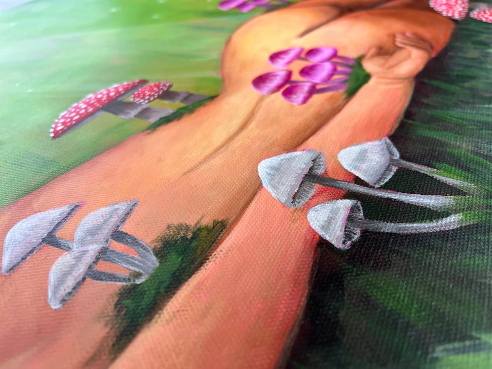 Original painting of a woman lying on the forest floor with many different mushrooms growing off of her. Green fog can be seen in the background and small orbs float in the air, giving the setting a spooky, yet whimsical feel.