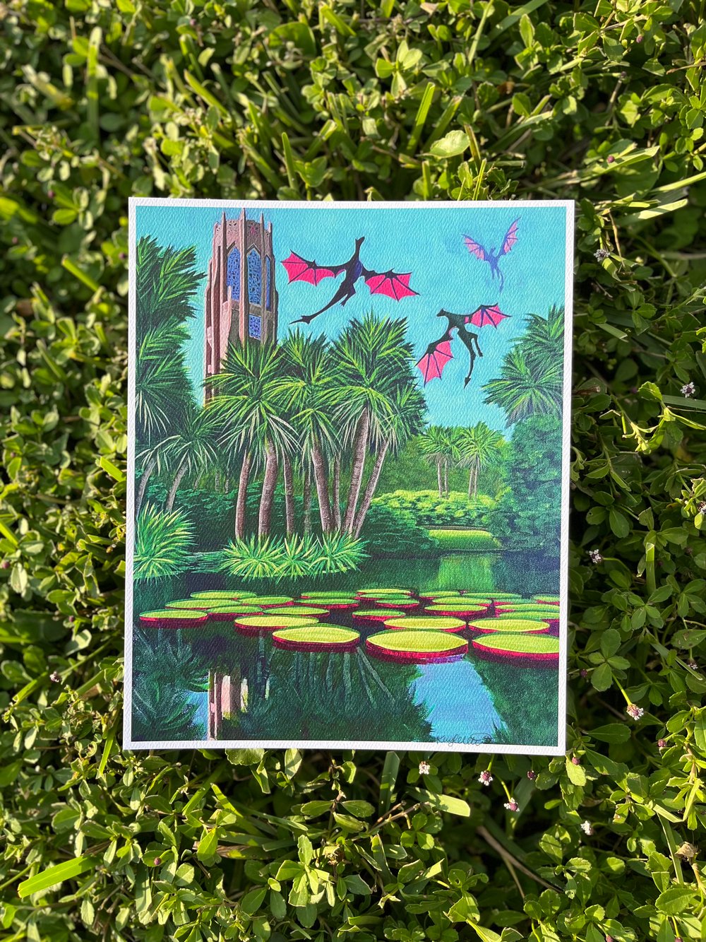 This print features three dragons flying over the singing tower and ponds at Bok Tower Gardens in Lake Wales, FL.