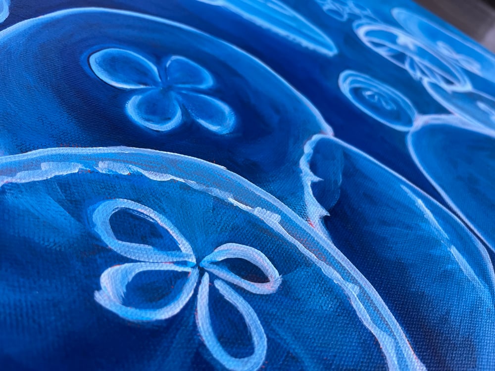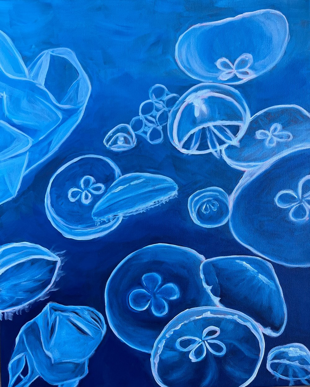 Moon jellyfish aren’t the only thing in this painting. Look a little closer and you’ll see a few plastic bags and a 6-pack ring too. Ocean trash often looks the same as jellyfish to feeding sea creatures, like sea turtles.