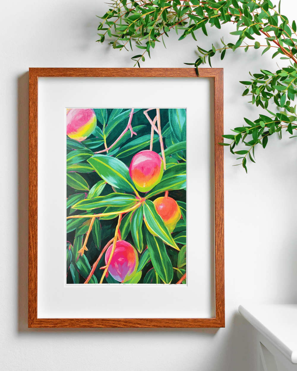 Print of mango fruits on a tree with bright pinks and greens as the primary colors.