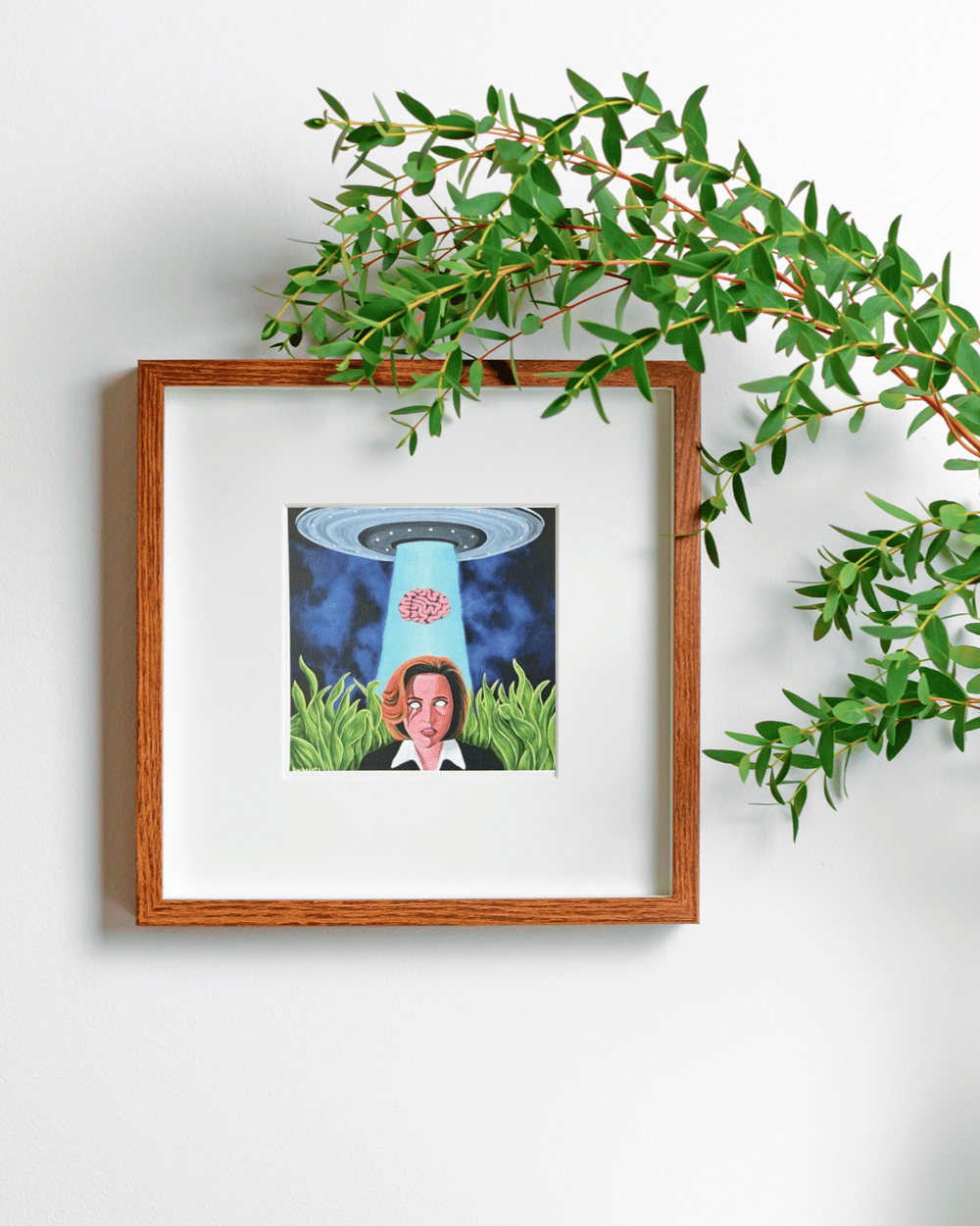 Print of Agent Dana Scully from the X-Files in a corn field with whited-out eyes and her brain levitating above her head (presumably being abducted) in a blue beam of light coming from a UFO.