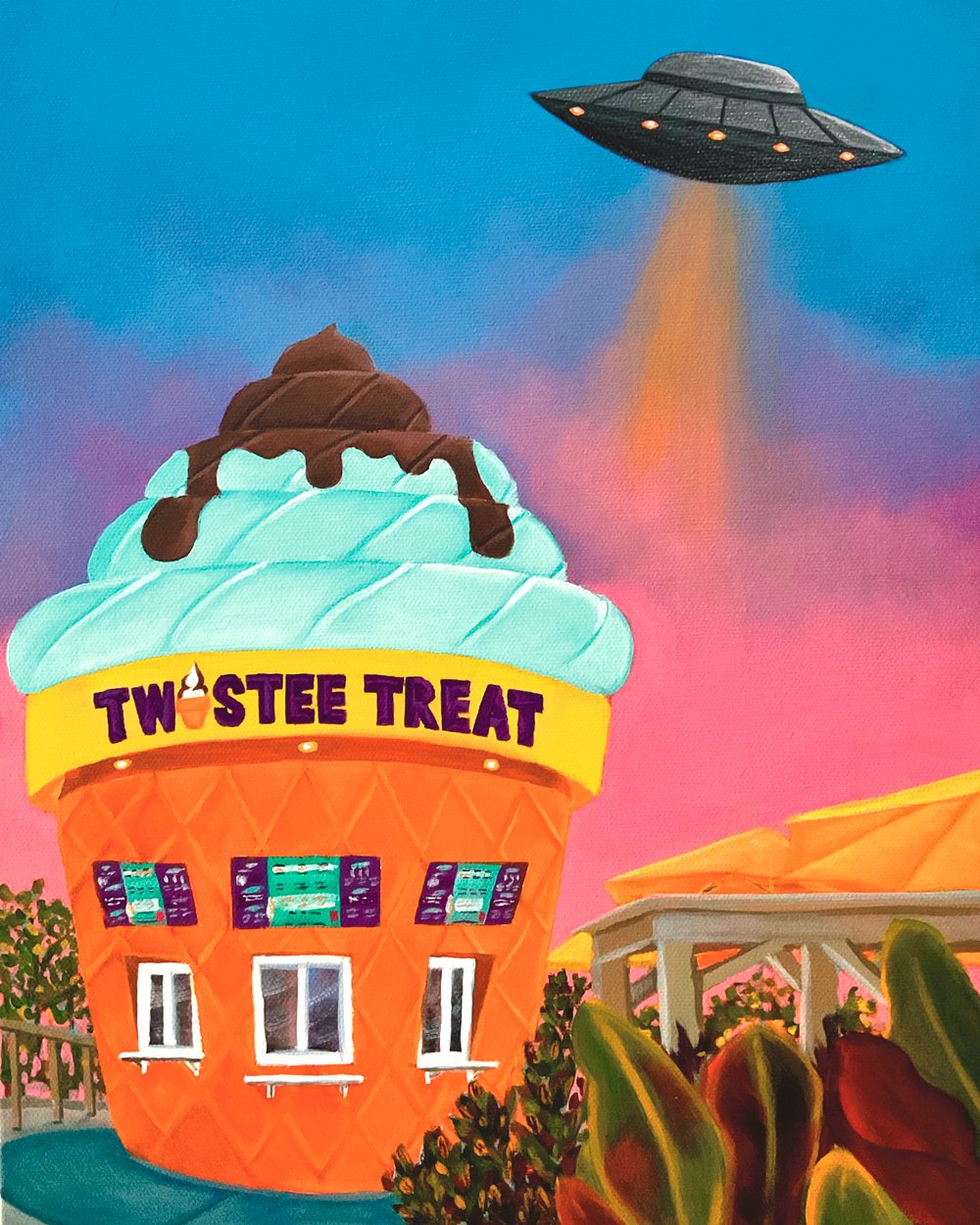 Print of a UFO flying over the Florida iconic soft-served-shaped Twistee Treat ice cream shop with a view of croton leaves peaking out in front and a bright pink/purple/blue sky.